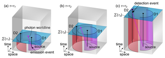 Before entering the interferometer, each incident photon is modeled as a bundle of N (a large number) worldlines (null geodesics) called particle worldlines, labeled with index . Only one worldline (for which ), referred to as the momentum worldline, carries the energy and momentum of the photon. Each worldline of this incident bundle is further characterized by the same polarization and phase. As the evolution parameter increases, the hypersurface shifts forward in the time dimension. Consequently, worldlines belonging to all optical components of the interferometer and particle worldlines of the photon, which have their endpoints on the hypersurface , are growing.