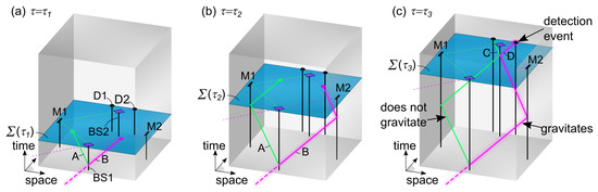Let us first analyze the case just after interaction with beamsplitter BS1, when the endpoints of the photon worldlines are situated just after BS1 (see Figure 5a). At each value of , quantum mechanics provides two quantum measures and , respectively, at the endpoints of paths A and B on the hypersurface , which are proportional to the probabilities and of finding the particle, respectively, along paths A or B (see Equation (9)). In this simple geometry, these quantum measures can be established in a deterministic and local way along null geodesics following the path integral formalism. In the 4+1 framework, we are allowed to propagate this information backwards in time, respectively, along paths A and B in a fundamentally local way as a function of . We further assume that this information is transferred much faster as a function of compared to other relevant -dynamics. As a result, and become available information at the past interaction event almost immediately after the interaction with BS1 as a function of . Hence, at the interaction event , there is enough information to spatially separate the N worldlines into two groups (along path A or path B) in a fundamentally local and deterministic way according to the following evolution law: