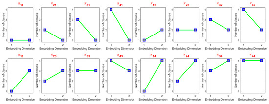 For each time series embedded into the dimensions of m and a given number of classes c, there exists a potential for the occurrence of dispersion patterns. Figure 1 illustrates all potential dispersion patterns for m = 2 and c = 4.