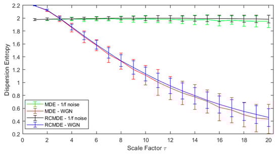 One hundred independent white Gaussian and one hundred independent pink noise series of 1000 data point length were created. MFDE, MDE, RCMDE, and RCMFDE were then applied to these signals for scale factors 1–20 (Figure 2 and Figure 3).