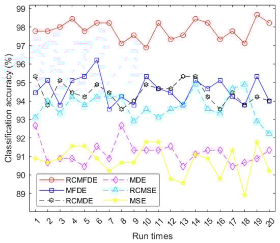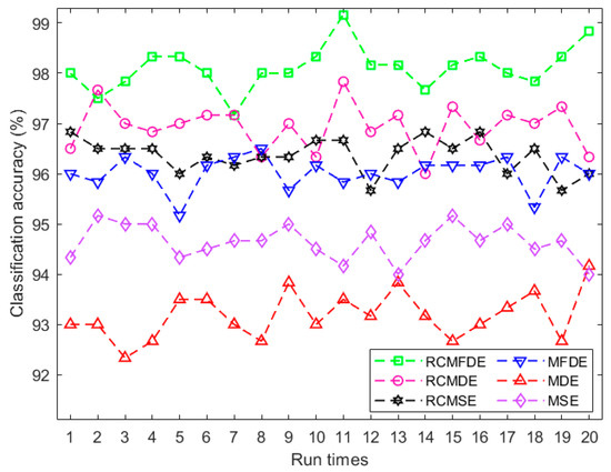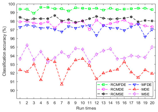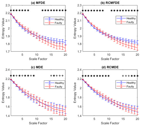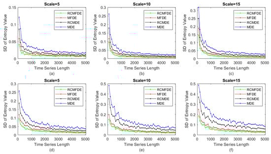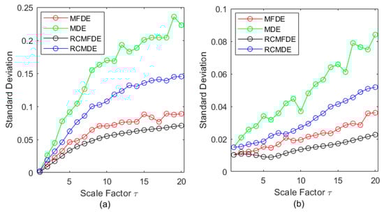 To assess the stability of the MDE, MFDE, RCMDE, and RCMFDE results, we calculated the SD of their results at each scale factor (Figure 4). The SD values suggest that MFDE and RCMDE, respectively, are more stable than MDE and RCMDE, and the lowest SD was obtained based on RCMFDE.