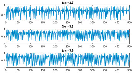 The waveforms resulting from the logistic map change: r = 3.7 (a), 3.8 (b), and 3.9 (c).