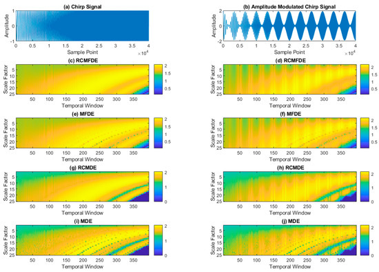 The number of possible dispersion patterns is recommended to be lower than the signal length . For MFDE, the CG process decreases the signal length to . Thus, for MFDE, it is suggested that . In RCMFDE, the coarse-grained time series of length are taken into account. Therefore, the number of all samples calculated in RCMFDE is and RCMFDE with the same length of gives reliable results. This particular feature is a matter of importance in short signals.