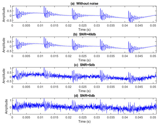 This paper assumes the fault characteristic frequency and damping coefficient as and , respectively. Also, and are the resonant frequencies of the bearing. The impulse amplitude magnitude factors are and , which specifies the damage intensity. The first and second harmonic amplitudes of the rotor are and , respectively.