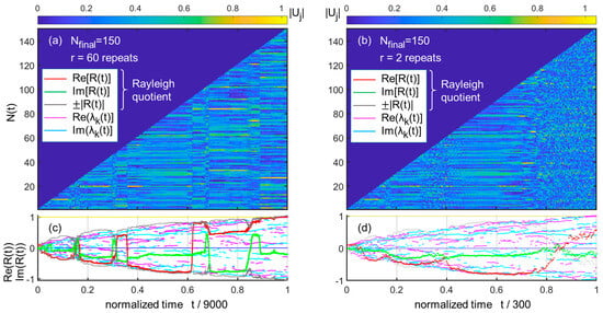 I can now present the results of Figure 1a–d, whereby I use parameters such that the convergence is good in case (a) with and weak in case (b) with only . Here, is the final size of the matrix in the computation (done with Matlab©). I discard the absolute growth of the eigenvector at this stage, as it is easily rescaled arbitrarily. The Figure 1a,c thus essentially show, in the form of two color maps, the growth of the vector with its stasis and quakes, through the moduli of its (nonzero) components. The final time is normalized to 1 for simplicity. Below the figure, to find out whether the “local dominant eigenvalue” is adopted (if so, one can reasonably infer that the corresponding eigenvector is also adopted, although the non-Hermitian setting calls for certain provisions), I make use of the simple tool of the Rayleigh quotient [20] :
