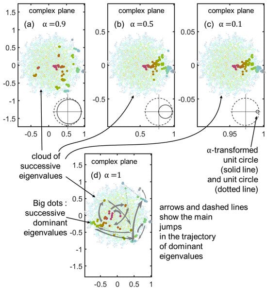 A sampling study of the largest eigenvalue position for successive matrices (of size ) for three representative values of (, and ) is shown in Figure 2a,c, along with the reference case () in Figure 2d. It is seen that as diminishes, the set of successive largest eigenvalues tends to cluster on the real axis, while having just the same configuration as that of the reference case but reduced by the factor .