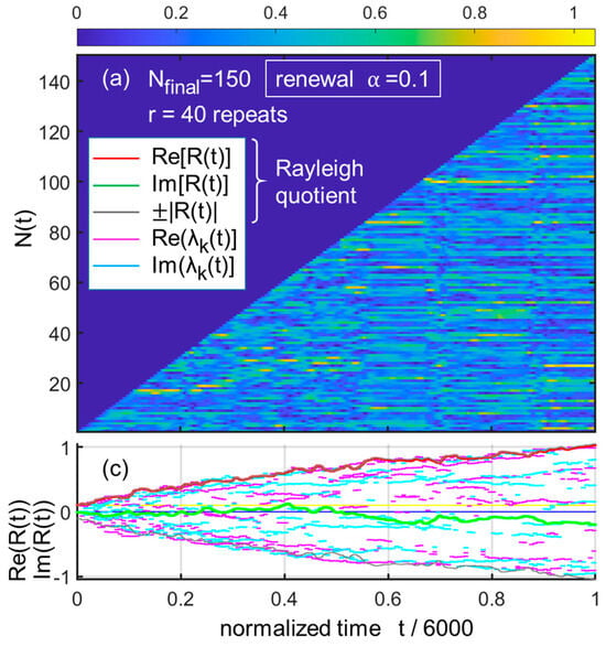 Same principle as Figure 1a,c but with a small renewal rate, and nearly as large a number of repeats ( Note the different trajectory of the Rayleigh quotient, which remains real. Nevertheless, the appearance of stasis is still clear (the blurred aspect for low values of is rather an oscillation regime).