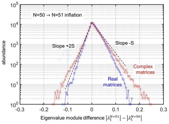 Comparison of the role of matrix inflation between real matrices and complex matrices. Using 100,000 draws of matrices of size with the same semi-circle radius of 1, I compare the statistical distribution (pdf) of the change in eigenvalue modulus difference upon an inflation process . The central part of the distribution (with abundance > 10% of max abundance) shows the same distribution for both types of matrices, with two different slopes using the logarithmic scale of abundance, differing by a factor of 2 (the smaller slope and thus the greater dispersion along the positive side of the abscissa since the difference is calculated along the increasing mean eigenvalue direction). However, for the extremes, the trend for complex matrices shows a “fatter” tail. These differences also correspond to the “fatter tail” of the largest eigenvalue at a given size.