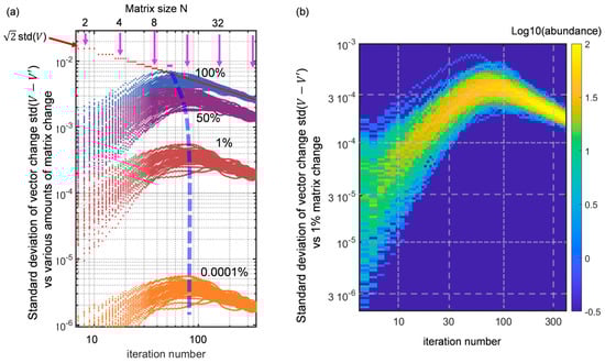 (a) Standard deviation of the vector, for variably modified matrices , as a function of the number of iterations in log-log scales. The coefficient (in percent) is used to index the four curves shown, based on 50 draws. The top red curve is the natural upper limit based on the vector’s own standard deviation; hence for identically, normally-distributed and with both having complex coefficients. The thick blue dashed line is a visual guide to the shifting maximum of the curves; (b) Color-coded histogram (log10(abundance), cf. color bar) for the same quantity and the case = 0.01, based on a few thousand draws, giving a better view of the tails of the distribution at different points.