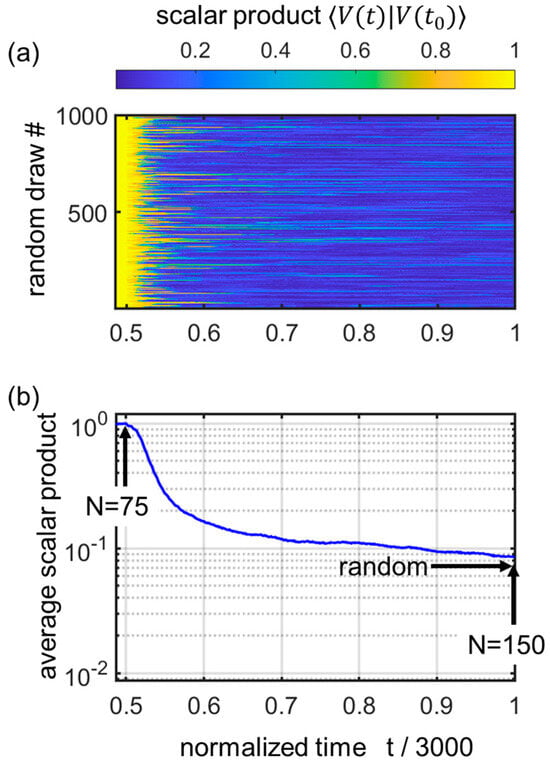 Memory study tackling the ergodicity issue. Vectors are iterated with different random realizations, after a given initial start and inflation from to (with repeats, thus up to . Then, from to , ( to ), a set of 1000 random different inflation scenarios is considered. To see how the system forgets its past, I track the scalar products on the “future” side of . (a) Colormap of the 1000 scalar products moduli over time, showing variable “inheritance” scenarios. (b) Average of the 1000 cases. There is a rapid initial decay over a period typical of the q-exponential law of spacing (. This is followed by a more sluggish decay towards the random limit, indicated by an arrow.