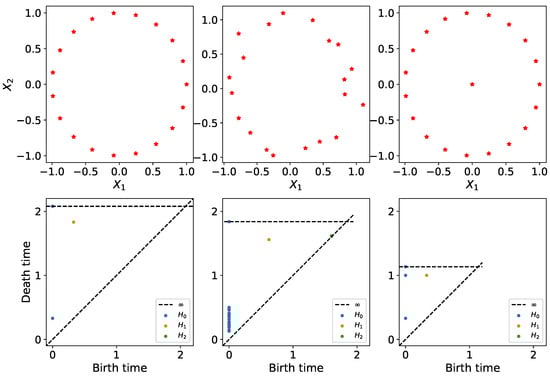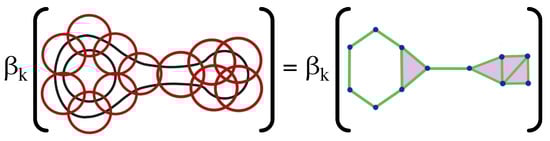 Given a topological object with a filtration, as defined in Equation (5), the corresponding homology analyzes the object by examining its k-dimensional holes through the k-th homology groups . The zero-dimensional holes represent the connected components or the clustering information; the one-dimensional holes represent loops, and the two-dimensional holes represent voids, etc. The rank of is known as the k-th Betti number; see the illustration in Figure 5. Refer to [53,54] for more rigorous definitions of these topological objects.