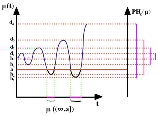 As parameter a increases, the corresponding sequence of pre-images (i.e., ) forms a sub-level set filtration. The topology of the pre-image only changes when a goes through a critical value with the non-vanishing second derivative or non-singular Hessian matrix. At every critical value, a component is either born (at local minima) or dies (at local maxima) by merging with another component.