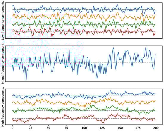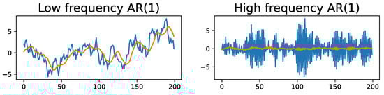 The Morse filtration summarizes the topological information contained in the mean of the time series, , by capturing the information contained in the arrangement of the local extrema. This implies that TDA incorrectly ignores the information contained in the noise structure, e.g., the covariance and dependence structure. Therefore, the practitioner has to verify that the assumptions of Equation (4) are valid. Otherwise applying the Morse filtration will result in significant information loss. For example, in the time series analysis, such a model could have disastrous consequences, as in the case of autoregressive processes; see Figure 4. In this example, the presence of a high-frequency first-order autoregressive (AR(1)) process does not modify the mean structure significantly, which does not alter the conclusions of the Morse filtration as the smoothing step cancels the noise structure and unravels the true mean structure. The presence of a low-frequency AR(1) noise process can be problematic because this can be incorrectly absorbed into the mean structure . This could lead the Morse filtration to erroneous conclusions.