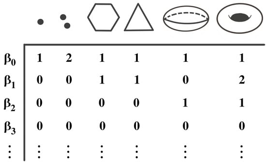 Examples of topological objects with the corresponding Betti numbers. The zero-Betti number () counts the number of components, the one-Betti number () counts the number of cycles or wholes, and the two-Betti number () counts the number of voids, etc.