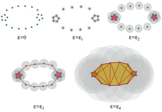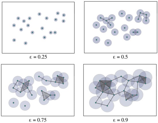 In practice, to construct the Vietoris–Rips filtration from a finite set of points, one looks at the increasing finite cover (, where is a ball centered around the ith point/node with radius r) of the topological space of interest at a wide range of radius values, as seen in Figure 7. Another example is considered in Figure 10, where the threshold values (where topological features appear or disappear) are denoted by . Once the persistent homology is constructed, it needs to be analyzed using some topological summary such as the barcode, the persistence diagram, or the persistence landscape. In Figure 11, we see the representation of the corresponding persistence diagram and the persistence landscape.