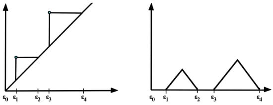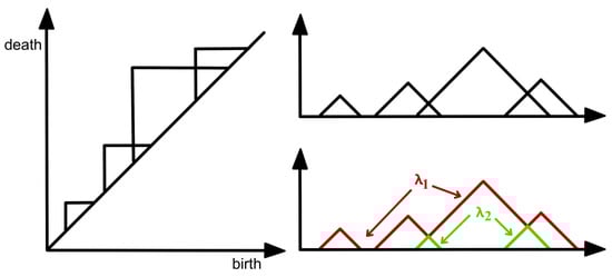 For these reasons, practitioners prefer to analyze a transformation (persistence landscape) of the persistence diagram, which is a simpler object (function), as defined in [37]; see Figure 11. The persistence landscape (PL) can be constructed from the persistence diagram (PD) by drawing an isosceles triangle for every point of a given homology dimension in the PD centered around the birth and death times, as shown in Figure 11. In case there are intersecting lines, the most persistent (highest) function is defined to be the PL (i.e., ); see Figure 13. For more details regarding the properties of the persistence landscape, refer to [37].
