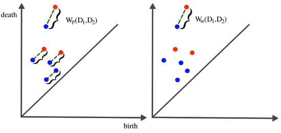 It is difficult to manipulate (e.g., take averages or compute distances) persistence diagrams (e.g., compute Bottleneck distance or Wasserstein distance; see Figure 12). In [36], the authors compare persistence diagrams. In particular, they show how it can be time-consuming to compute the Bottleneck or the Wasserstein distances as it is necessary to find point correspondence. Additionally, defining a “mean” (or center) or “variation” (or measure of spread) of a distribution persistence diagram is not straightforward, especially when the number of points in each diagram varies.