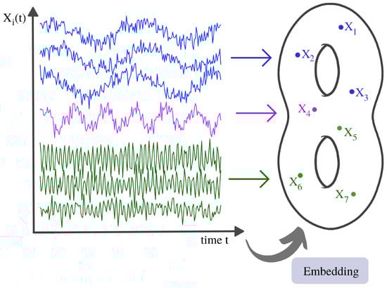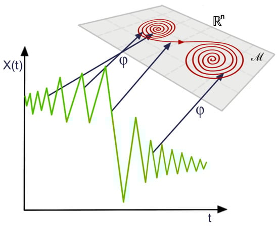 In a time-delay embedding, the aim is to reconstruct the phase space (the space that represents all possible states of the system) based on only one observed time series component, borrowing information from the lagged observations to do so. Under the initial assumptions, this is indeed possible since all the components are interdependent through the shared dynamical system. This phase space may contain valuable information regarding the behavior of the time series. For example, the time series might display some chaotic behavior in time; see Figure 14. However, in the phase space, it might show some convergence to some attractor (a region of the phase space toward which the system converges); see [38,39] for more details regarding the application of topological data analysis to time series data. The foundation of this method derives from the framework of dynamical systems. Indeed, Takens’s theorem states conditions under which the attractor of a dynamical system can be reconstructed from a sequence of observations, as can be seen in Figure 14.