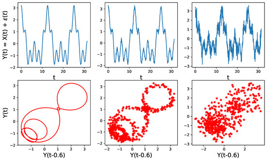 Point cloud embedding of a univariate time series using the sliding window method for different noise levels. Original time series (TOP) for various standard deviations of the noise (from left to right , , ), with corresponding time-delay embedding (BOTTOM). The dependence structure in this time-delay embedding cannot be visually observed even in the presence of a moderate level of noise.