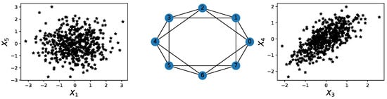 Illustration of a hidden cyclic pattern in the dependence structure. Left subplot: scatter plot between time series components and . Right subplot: scatter plot between time series components and . Middle subplot: the cyclic latent dependence network of the entire multivariate time series.