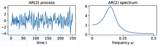Consider the case where the roots of the , denoted by and , are both (non-real) complex-valued and, hence, can be expressed as and , where the phase and the magnitude satisfy causality [56]. For this latent process , suppose that the sampling rate is denoted by and the peak frequency is (8–12 Hz). Then the roots of the AR(2) latent process are and where the phase . In practice, we can choose for a given Hz and the root magnitude is or a number greater than 1 but “close” to 1, so that the spectrum of is mostly concentrated on the alpha band (8–12 Hz). The corresponding AR(2) coefficients are and . An example of such a stationary AR(2) process can be visualized in Figure 17.