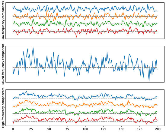 In order to show how TDA can be applied to analyze the dependence pattern of a real multivariate time series, we illustrate via simulations how topological patterns, such as cycles and holes, can arise in multivariate time series. Based on the idea, developed in [31,55], the simulated brain signals will be constructed as mixtures of latent frequency-specific oscillatory sources, i.e., a mixture of frequency-specific neural oscillations. Each of these oscillatory random processes can be modeled by a second-order autoregressive (AR(2)) process and, thus, the simulated EEG will be a mixture of these AR(2) processes. A latent oscillatory process with a spectral peak at the alpha band (8–12 Hz) can be characterized by an AR(2) process of the following form: