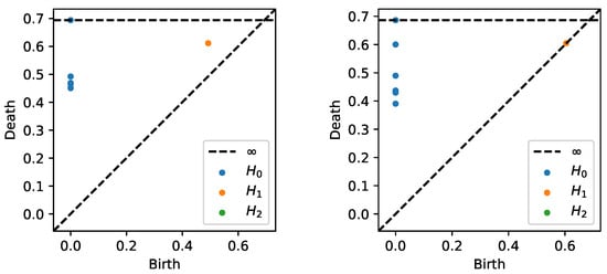 The persistence diagram (PD) is constructed based on the times of birth and death of the topological features in the filtration as seen in Figure 11. Thus, for every birth-death pair, a point is represented in the diagram, e.g., (, ) and (, ). The points in the PD are color-coded so that every color represents a specific dimension of the homology (dimension 0 for connected components, dimension 1 for cycles, etc.).