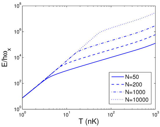 A plot of the scaled internal energy versus the boson number N in a 2D ideal boson gas. The plot is drawn for , 15, 50, 100 nK. We select the axial angular frequency Hz and the anisotropy parameter .