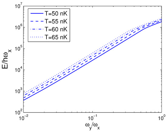 At this point, we start to depict the transition behavior of ideal bosons in a 2D anisotropic harmonic potential. Based on Equations (26), (44), and (45), Figure 14 reveals the internal energy E versus the temperature T for and . Owing to Equation (44), we discover that, at and , nK. In Figure 14, as the temperature T traverses nK, the internal energy E is successive and flat. Computations also demonstrate that, at nK, both the entropy S and the free energy F are successive and flat and do not reveal any clue of phase transitions.