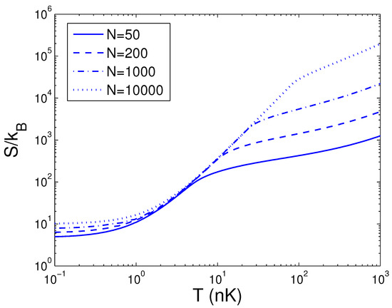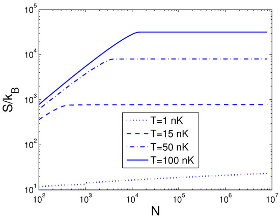 A plot of the scaled entropy versus the boson number N in a 2D ideal boson gas. The plot is drawn for , 15, 50, 100 nK. We select the axial angular frequency Hz and the anisotropy parameter .