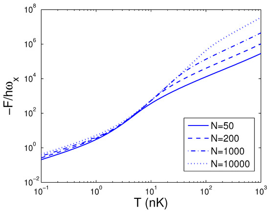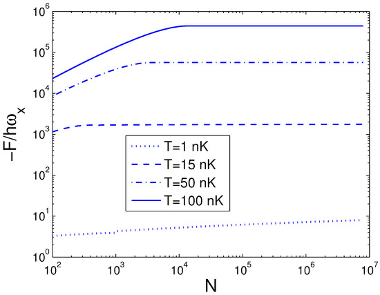 A plot of the scaled free energy versus the boson number N in a 2D ideal boson gas. The plot is drawn for , 15, 50, 100 nK. We select the axial angular frequency Hz and the anisotropy parameter .