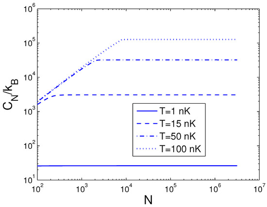 A plot of the scaled heat capacity versus the boson number N in a 2D ideal boson gas. The plot is drawn for , 15, 50, 100 nK. We select the axial angular frequency Hz and the anisotropy parameter .