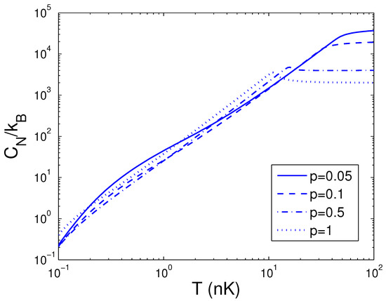 Afterwards, the reduced chemical potential is employed in Equation (32) to acquire the heat capacity at constant number. is a function of temperature T, boson number N, and anisotropy parameter p. If one evaluates , one must associate Equation (18) with Equation (32). Based on Equation (32), changing of the scaled heat capacity with the boson number N is presented in Figure 10 for various T. We select the anisotropy parameter . An interesting discovery is that, at nK, for all N. Figure 10 demonstrates that, for a finite number of 2D bosons, the system possesses an approximate critical boson number . If T is fixed, the heat capacity is an ascending function of the boson number N when N is smaller than . As , corresponds to a constant dependent of T. According to Equation (32), changing of the scaled heat capacity with the temperature T is presented in Figure 11 for various N. We select the anisotropy parameter . Obviously, at K. Figure 11 demonstrates that, for and at a fixed N, there is an inflection point on the curve of versus T, which corresponds to the critical temperature . If N is fixed, the heat capacity is a fast ascending function of temperature T when T is smaller than , but at , it is a slowly increasing function of temperature T. In Figure 12, we also display changing of the scaled heat capacity with the temperature T for various p at . Figure 12 reveals that, for , the system possesses a critical temperature at which attains a maximal value. The specific-heat maximum is a monotonically increasing function of anisotropy parameter p. The circumstance of phase transitions grows clearer and clearer as the anisotropy parameter approaches unity. The specific-heat maximum represents an important marker in this transition. When , , which corresponds to the classic limit. According to Equation (32), in Figure 13 we show the variation of the scaled heat capacity with the anisotropy parameter p for various N. The temperature is fixed at nK. It is interesting to note that, for N = 10,000, possesses the minimum at and the maximum at . For , is a monotonically descending function of anisotropy parameter p. A fine character of the accurate solutions in the above is that they are effective for arbitrary T, N, and p.