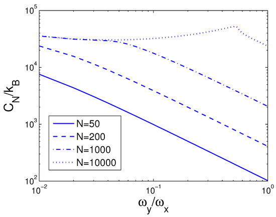 A plot of the scaled heat capacity versus the anisotropy parameter p in a 2D ideal boson gas. The plot is drawn for , 200, 1000, 10,000. We select the axial angular frequency Hz and the temperature nK.