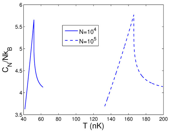 In what follows, we can inspect the transition properties of the heat capacity at constant number. As and since , . As , is resolved by the partial derivative of the expression . As a result, we obtain the heat capacity at constant N as follows: