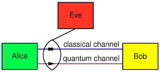 In the BB84 QKD protocol, two legitimate parties who wish to establish a secure communication, usually named Alice and Bob, are linked via one quantum channel and one authenticated (but not necessarily encrypted) classical channel, while an eavesdropper, Eve, has a physical access to both channels, as shown in Figure 1.