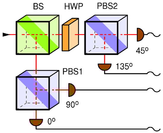 A receiver for the BB84 protocol with a passive random number generator; the measurement basis is selected randomly via the first polarization-insensitive beam splitter (BS). Each base consists of a polarizing beam splitter (PBS) and two detectors. The (45°, 135°) base is realized by placing a properly rotated half-wave plate (HWP) in front of it.