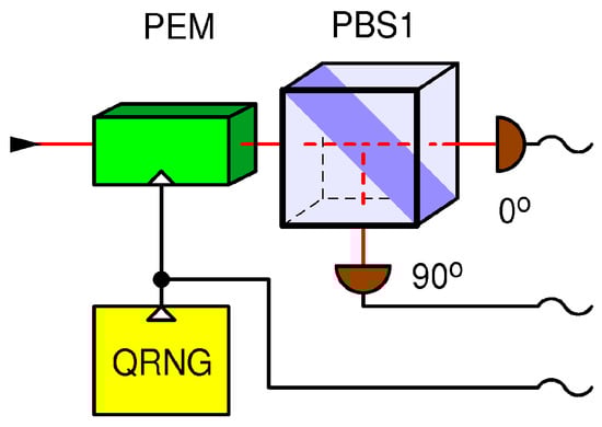 In the receiving station (Bob), which was broken in Ref. [5], the random choice of detection bases is performed actively by means of a phase electro-modulator (PEM) driven by an explicit electronic QRNG, as shown in Figure 3. The state of the QRNG (0 or 1) determines the receiving base. According to the above discussion, I assume that the QRNG is private, meaning that it cannot be manipulated or predicted by Eve. This base choice technique functions exactly as required by the BB84 protocol for single qubits. It also diverts all the incoming power of a strong fake state to the selected base.