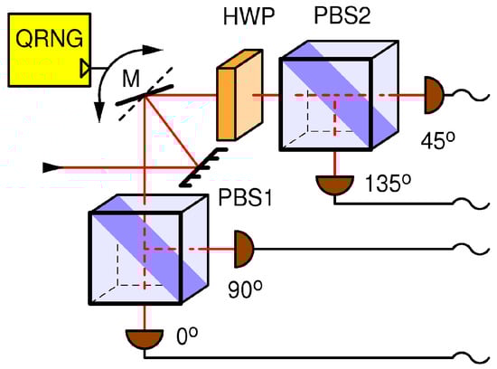 Receiver for a BB84 protocol with an exclusive active receiver; the receiving basis is determined by the quantum random number generator QRNG, which flips the mirror (M) between two possible angles, each of which reflects all of the light into one and only one measurement basis.