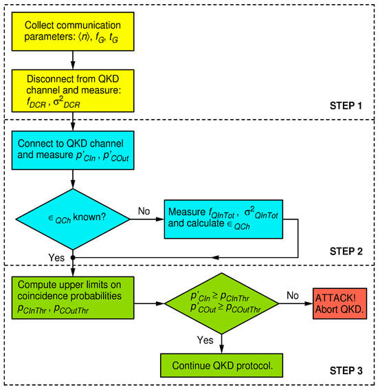 To defend against strong-light attacks, I focus on two pairs of equations: Equations (5) and (8), which model the in- and out- of-gate coincidence probabilities during the execution of a pristine BB84 QKD protocol, and Equations (10) and (11), which model the same coincidence probabilities but under a strong-light attack. The huge increase in the coincidence probabilities under a strong-light attack, even for an injected light level far less than what is required to mount an actual blinding attack, presents a robust figure of merit for discerning the undisturbed quantum communication from an attack condition. In modern QKD systems, the output of each detector is connected to a dedicated channel of a time-tagger, and time stamps are recorded; thus, the above probabilities can be evaluated using a simple data analysis. The defense strategy, which is valid for the receiver in Figure 4, is outlined by the flow chart in Figure 5, and the details are described below.