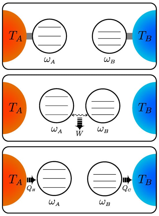 since we describe the thermalization with each reservoir by weak coupling and energy-preserving interactions []. Notice that under this approximation no work is generated by connecting and disconnecting the systems with the reservoirs [,,].