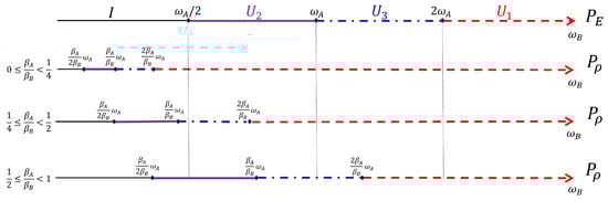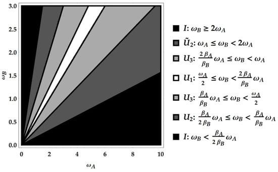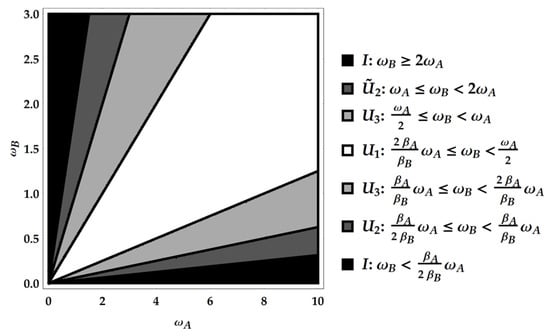 The product together with the composition rules for , and explored above allows to find the ergotropic transformations for each ergotropic regime identified by combining an poset with a poset. In particular, we remark that the ergotropic transformations resulting from the product must be again , , and . There are five overall, considering the identity too, which pertains to initial passive states. We provide a direct visualization of the landscape of ergotropic transformations in Figure 3, Figure 4 and Figure 5. Having set , each figure is linked to a different regime for the ratio . As outlined in Figure 2, we can identify three distinct ranges of with two critical values, namely and . For each case, we show the ergotropic transformation related to each poset. In particular, we set in Figure 3, in Figure 4 and in Figure 5. Firstly, we observe that in the first two cases, all the transformations found above appear (except , which pertains to the regime ). In the case of Figure 5, is never present and the number of passive regimes becomes four. Notice that in the region , it is possible to take the limits and . In this case, one of the passive regimes disappears and most of the parameter region is dominated by the swap. On the contrary, approaching the critical point we see that the region where the swap extracts the ergotropy shrinks until it vanishes at the critical point. In the second case, in Figure 4, the swap plays again a role, but the passive regimes grow as well until, at the critical point , the ergotropic region of vanishes and is replaced for by passive regimes. Of course, at , the whole frequency subset is passive.