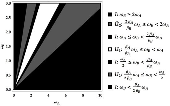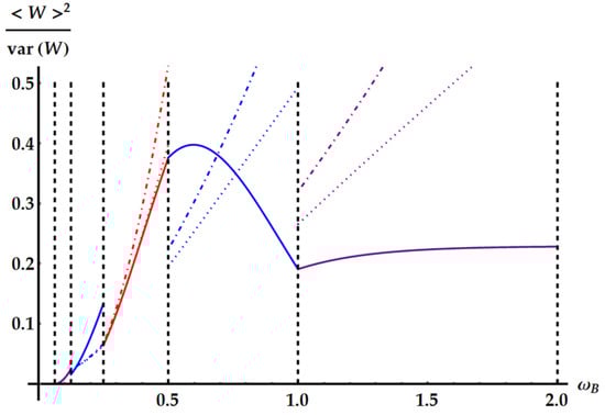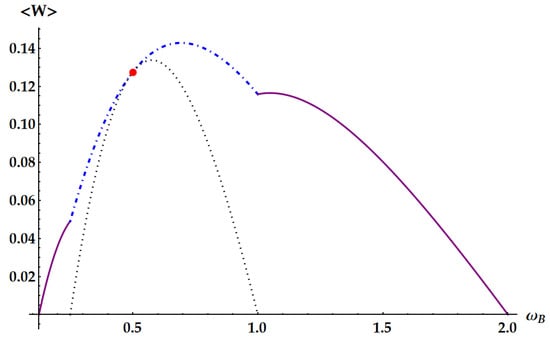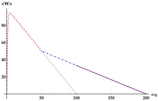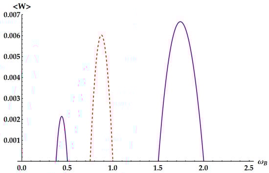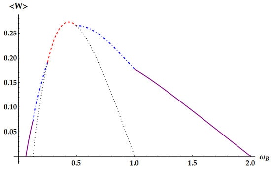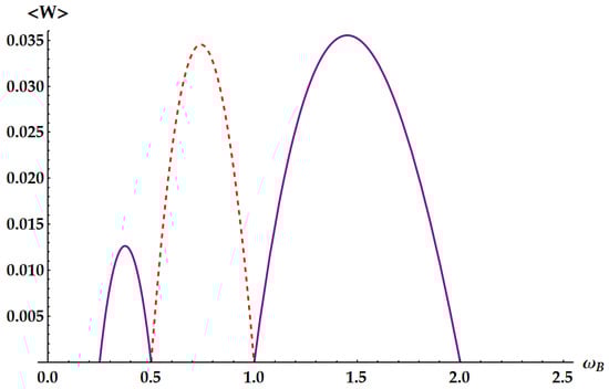 Here, we see the effects of the atypical behavior of : the extracted work is not proportional to any frequency gap. On the contrary, the frequencies and appear multiplied with different weights. Notice that for , one has and from the second line of Equation (24) the double swap extracts the same work as , i.e., . Instead, for , namely , one has and . Finally, for , we have and again . In Figure 6, we represent the ergotropy extraction in the case . In particular, we set the ratio , as in Figure 3, with . Note that the pretended discontinuities in the transitions between different ergotropic regions are just cusps, as it can be recognized in Figure 7, Figure 8, Figure 9, Figure 10 and Figure 11.