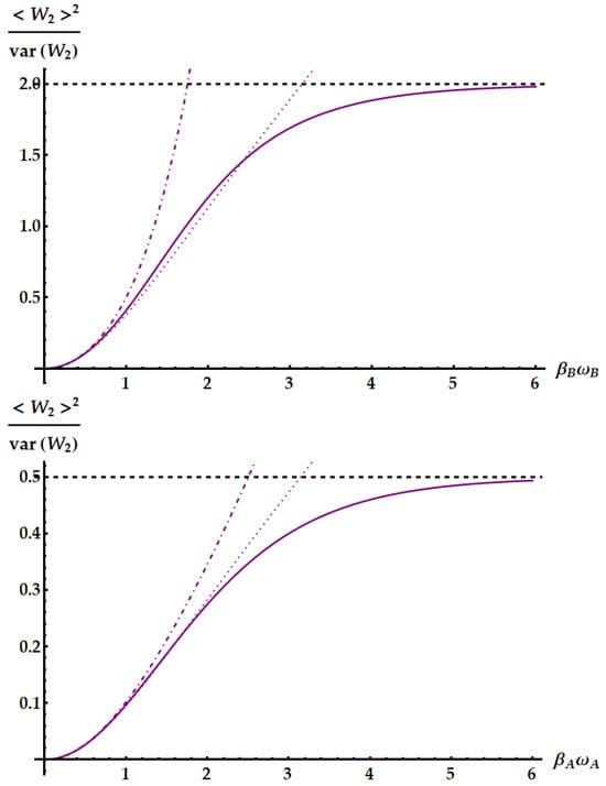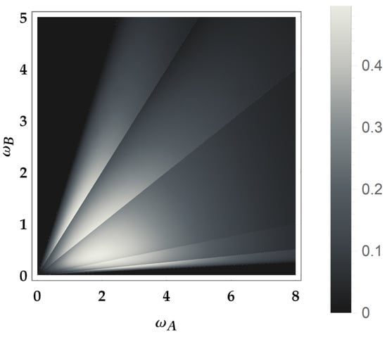 Here, we recognize the action described above: the lower frequency qutrit is taken as a qubit whose gap is for and for , so that the extracted work is proportional to and , respectively. As expected, the work extracted from is obtained from the one extracted by just by swapping A with B. From Equations (20)–(22) one also verifies that