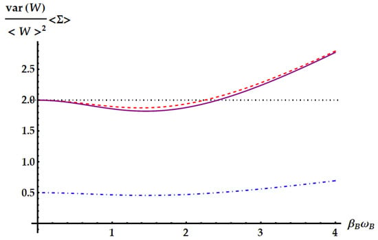 We can evaluate the moments of W and through the derivatives of the characteristic function, according to Equations (A27) and (A28) of Appendix A. Due to the conservation laws for , , and as in Equations (18) and (19), according to Equation (A34), we have