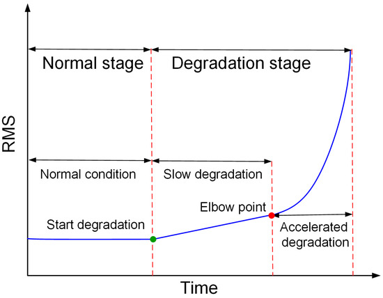 In addition, determining the first prediction time is a worthy concern [21,22], which will affect the accuracy of the RUL estimate. The root mean square (RMS) is the most commonly used physical property that reflects the increase in vibrational energy with degradation [23]. Figure 1 shows the complete process of a rolling bearing degrading from a healthy state to degradation to failure, using RMS as a health indicator. In the healthy stage, the curve shows a relatively smooth trend along with stochastic fluctuations; after a failure occurs, the curve first shows a linear trend and is in the slow degradation stage; as the damage continues to increase, the bearing enters the accelerated degradation stage. If the prediction takes into account the starting point of bearing degradation, it is impossible to accurately calculate the duration of the bearing in the slow degradation stage and the accelerated degradation stage, respectively, and it is therefore difficult to estimate the remaining life of the bearing. Elbow point detection is based on the premise that there are two apparently different degradation trends, slow degradation and accelerated degradation. The bearing degradation trend at the onset of degradation is linear, while it becomes closer to exponential during the accelerated degradation phase as the failure deepens and spreads. Rigamonti et al. [24] proposed an elbow point identification method based on a Z-test. However, the features describing the trend of bearing degradation do not satisfy the prerequisites of the Z-test well. Baptista et al. [25], using different neural network models to detect elbow points, incorrectly identified spurious fluctuations as elbow points during detection, due to the presence of spurious fluctuations in the actual degradation process of the bearing.