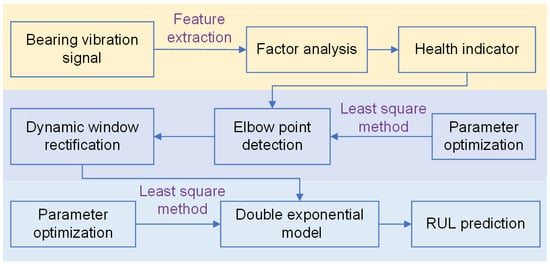 In this section, a new statistical method is proposed for the RUL estimation of rolling bearings. The whole prediction process is shown in Figure 2. The overall method can be divided into five parts: feature extraction, health indicator construction, elbow point detection, dynamic window correction and RUL prediction.