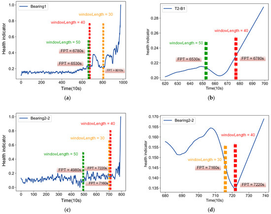 Consideration of the size of the sliding window is essential. In the paper, we analyzed the length of sliding windows on two public datasets [26,27]. According to different window lengths, health indicators are divided into multiple subsequences. The conditional entropy of the subsequence is calculated as the information loss under the current sliding window length. The length of the sliding window is determined to be between 30 and 50 by calculating the information loss and the rule of thumb. Figure 3 illustrate the impact of different window sizes on elbow detection. On the IMS bearing dataset, the corresponding FPTs are 8010 s, 6780 s and 6530 s when the window sizes are 30, 40 and 50, respectively. Similarly, the corresponding FPTs on the PHM2012 bearing dataset are 7160 s, 7220 s and 4980 s, respectively. As can be seen from the two detail figures, the performances of the window sizes at 30 or 50 can both lead to bias in the determination of the FPT, due to differences in individual bearings. The results show that, when the sliding window size is 40, the degradation point of T2-B1 is 6780 s and the degradation point of bearing2-2 is 7220 s. From the figure, it can be seen that the elbow point detection method proposed in this paper can accurately identify the accelerated degradation points and effectively avoid the limitation of spurious fluctuations.