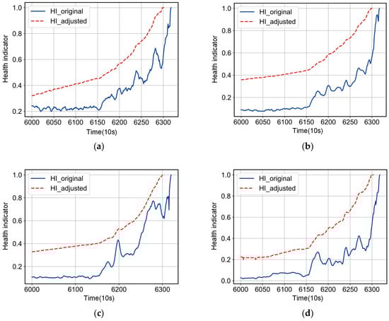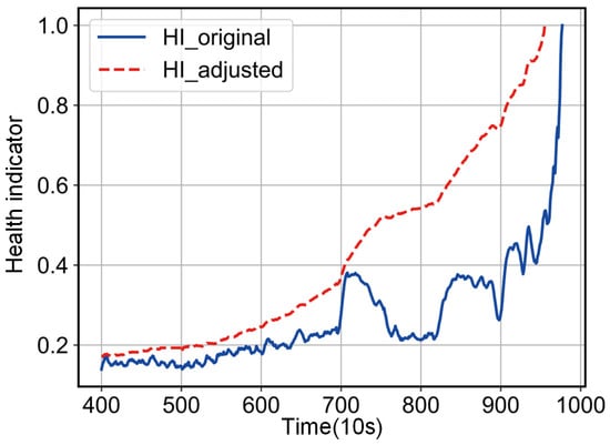 When , is adjusted to the mean value for the samples in the current window; when , is adjusted to the lower bound of the 3σ interval; other sample points that do not satisfy the above conditions are taken unchanged. As shown in Figure 4, the experiment shows that the HI_original, adjusted in the above way, obviously shows a monotonic trend, which eliminates the influence of random fluctuations on the prediction accuracy well.
