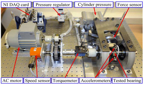 The data of the IEEE PHM2012 Data Challenge were collected on the PRONOSTIA platform, as shown in Figure 5. Table 2 provides a detailed description of the composition of the dataset. The platform was designed by the French FEMTO-ST Institute and consists mainly of a rotating part, a degradation generating part and a measuring part. It is able to provide realistic experimental data for describing the degradation of rolling bearings during their entire life. The platform is able to provide constant and variable operating conditions to accelerate the degradation of the bearing, while collecting monitoring data (speed, temperature, vibration, etc.) in real time. The experiments considered data from three different loads (i.e., 1800 rpm and 4000 N, 1650 rpm and 4200 N and 1500 rpm and 5000 N) and collected vibration accelerations in both horizontal and vertical directions of the bearing housing, with a sampling frequency of 25.6 kHz and 2560 samples recorded every 10 s. For safety reasons, once the amplitude of the vibration signal exceeded 20 g, the test was stopped, and the bearing was considered to have failed. The entire data set contains all possible types of bearing failures during the degradation process.